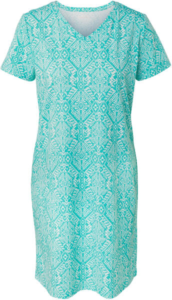 Hálóing Szín: Fehér-türkiz nyomott minta Anyag: 58% pamut (támogatja a Cotton made in Africa kezdeményezést), 39% viszkóz, 3% elasztán Méretek: Teljes hossz: kb. 94 cm (M 40/42-es méret) Fazon: Regular Fit Puha anyag pamutból és viszkózbólV-nyakkivágással és rövid ujjakkalTartós és rendkívül mosásálló, kiváló minőségű márkás elasztánnalEz a hálóing támogatja a termelőket.