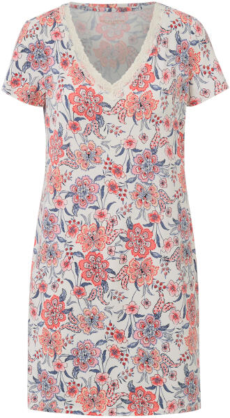 Női hálóing, csipkés, virágos, krém Szín: Krémszínű, színes, nyomott virágmintával Anyag: 48% pamut (támogatja a Cotton made in Africa kezdeményezést), 47% modál, 5% elasztán Méretek: Teljes hossz: kb. 94 cm (M 40/42-es méret) Fazon: Regular Fit Könnyű anyag pamutból és modálbólV-nyakkivágás finom csipkévelOldalhasítékokTartós és a mosást rendkívül jól tűrő, kiváló minőségű, márkás elasztánnalEz a hálóing támogatja a termelőket.